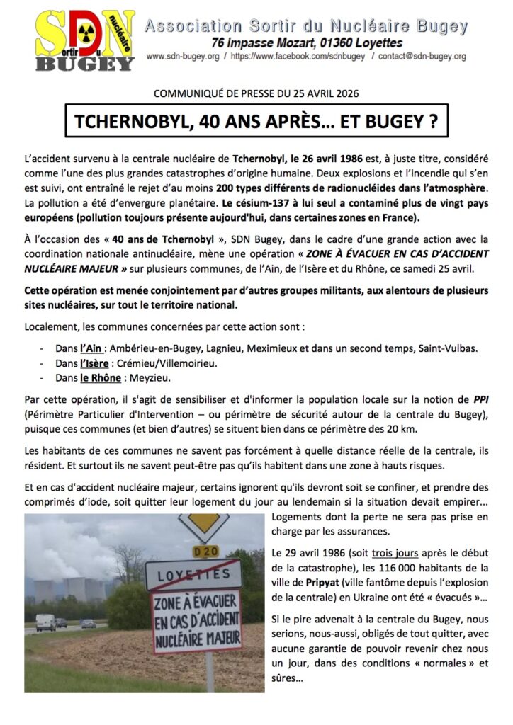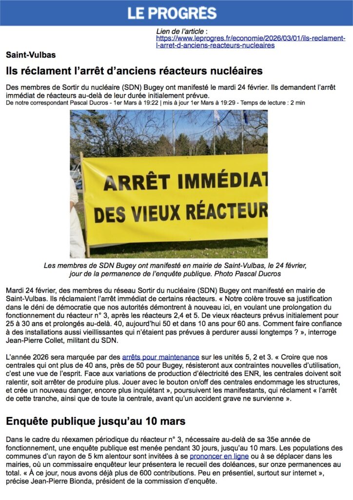 Ce lundi 9 février 2026, démarre l’enquête publique destinée à déterminer si le réacteur Bugey 3 est apte à être prolongé. SDN Bugey va une nouvelle fois boycotter cette enquête publique qui n’est qu’un …