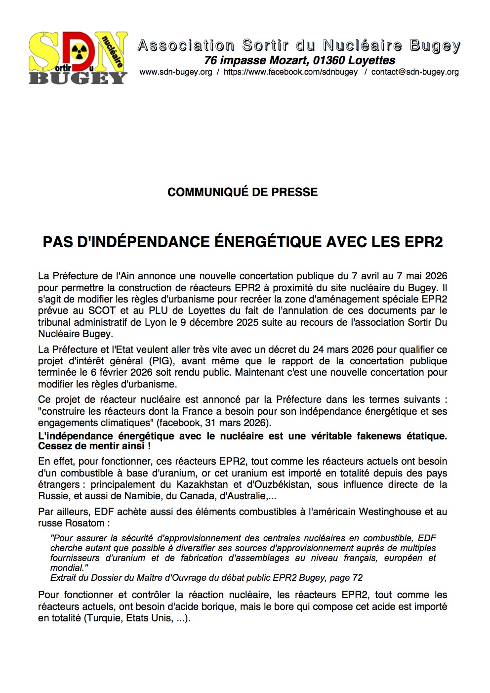 Suite aux dernières déclarations de Monsieur le Préfet de l’Ain quant au projet d’EPR2 à Bugey et la « prétendue indépendance » énergétique qui allait en découler, nous tenons à publier ce communiqué de presse :