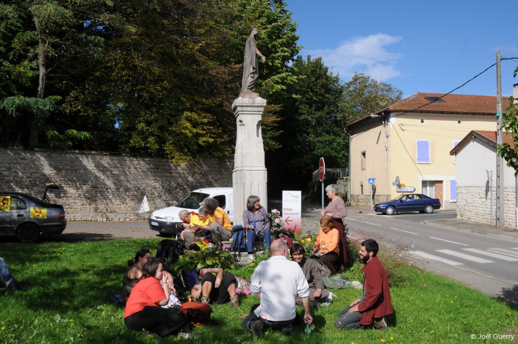 Un groupe est donc parti précipitement vers 7h ce matin de la ville de St Vulbas où un grave accident à eu lieu. Nous n’avons pour l’instant aucune explications quant aux causes et l’ampleur de la catastrophe (du moins de sources fiables et donc indépendantes). Les autorités compétentes parlent d’une petite fuite lors des phases de remises en service du réacteur Bugey 4. Apparement sans gravité et sans aucune conséquence pour les populations environantes. C’est du moins la version des autorités qui invitent cordialement ses administrés à rester chez eux et attendre les consignes. Elles leurs conseillent de regarder les grandes chaines qui les informent en temps réel depuis leur QG de Paris sur la situation ici à St Vulbas (01). On sait en tout cas que la sirène et toutes les procédures d’alertes prévus et de confinement n’ont pas fonctionné (panne de l’opérateur Orange gérant l’envoi de SMS aux habitants notemment). Des groupes de personnes ont alors décidé de fuir malgré l’interdiction la zone contaminée. D’après les premiers témoignages receuillis par nos courageux sympatisants, ces personnes disent qu’elles ont retenu les leçons de la catastrophes de Tchernobyl et Fukushima et quelles ne croient plus les mensonges messages rassurants des autorités compétentes (l’AIEA, l’OMS, Tepco, le Ministère de la Santé, de l’Industrie, du redressement productif, de l’ASN, EDF, Areva, les grands médias aux ordres sans oulbier le Pr Pellerin ). Elles ont décidé en toute autonomie de raison, de fuir avec leurs enfants et quelques affaires personnelles abandonnant tout le reste pour gagner à pied Lyon…