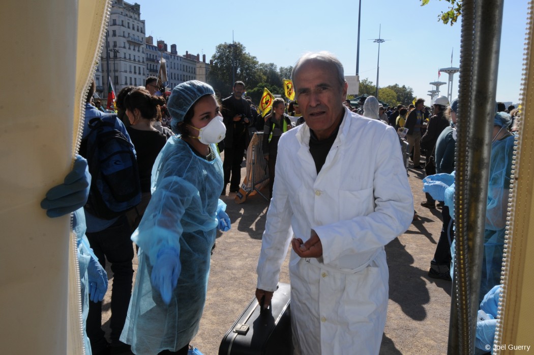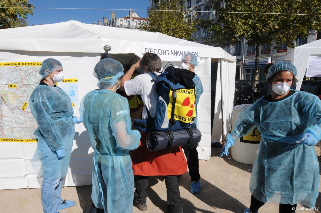 2 marchent qui convergeaient sur Lyon depuis St Vulbas, sas de décontamination, recrutement de liquidateurs, recherche d’hébergements d’urgence… Près d’un 1500 personnes ont joué ce samedi le jeu du scénario catastrophe pour simuler l’arrivée de réfugiés en cas d’accident nucléaire à la centrale du Bugey, située à seulement 35 km de Lyon…